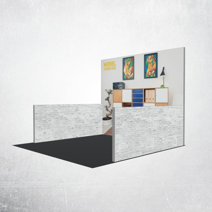 Modco Modular Display 14 is a three-dimensional 10’ x 10’ pre-designed exhibit booth. Stylish and lively, it incorporates a 10’ wide backwall with two 10’ wide sidewalls. Tool-free perforated modular aluminum frames make up this booth and connect with toolless pin connectors during assembly. A flawless finish completely covers the perforations.