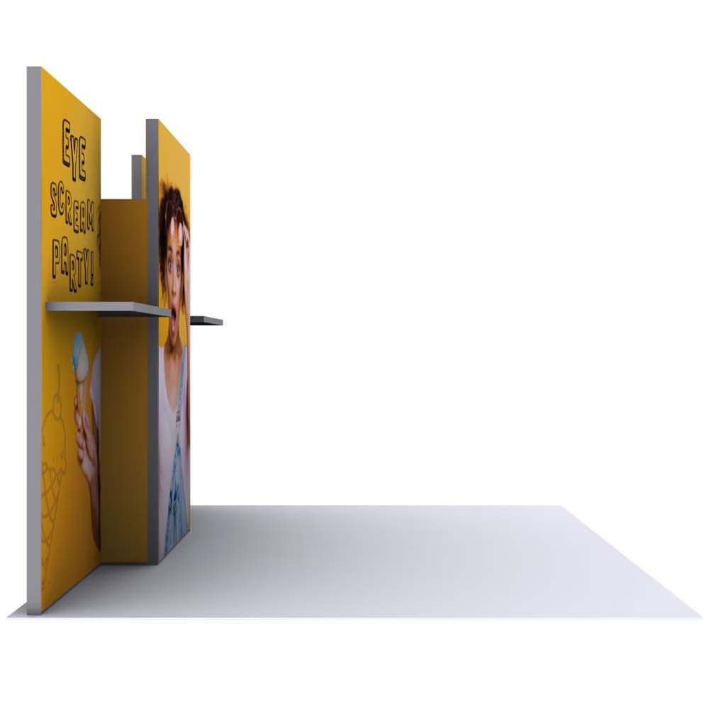 Modco Modular Display 3 is a three-dimensional 10’ x 10’ pre-designed exhibit booth. Stylish and lively, this booth is built using tool-free perforated modular aluminum frames. Multiple size frames connect using tool less pin connectors. Features shelves along the backwall to showcase your products. For a flawless finish, cover the perforations completely.