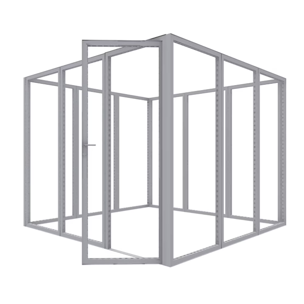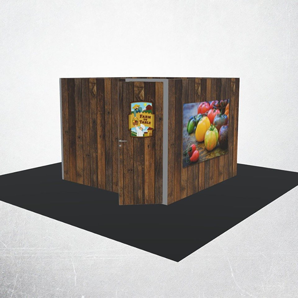 Modco Modular Display 6 is a three-dimensional 10′ x 10′ pre-designed exhibit room. Stylish and lively, this room is built using tool-free perforated modular aluminum frames. Multiple size frames connect using tool less pin connectors. The room features a door w/ lockset and key to complete your meeting room. For a flawless finish, cover the perforations completely.