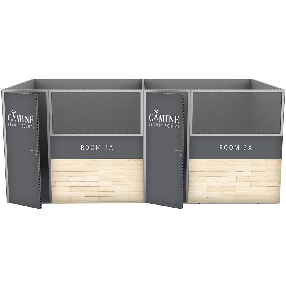 Modco Modular Display 17 is a three-dimensional 20’ x 10’ pre-designed configuration featuring two separate 10′ x 10′ exhibit rooms with front side acrylic windows. Stylish and lively, these rooms are built using tool-free perforated modular aluminum frames. Multiple size frames connect using toolless pin connectors for a quick and easy build. Each room features a door w/ lockset and key. A flawless finish completely covers the perforations.