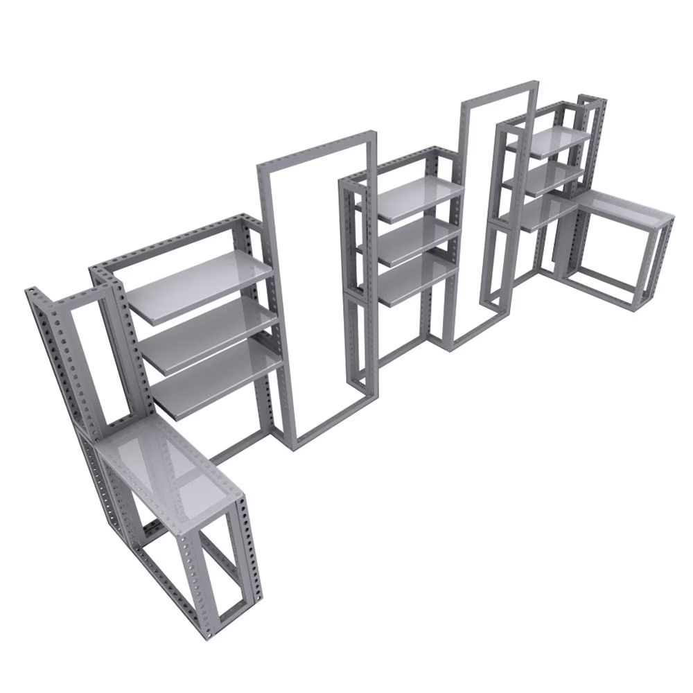 Modco Modular Display 3 is a three-dimensional 20’ x 10’ pre-designed exhibit booth. Stylish and lively, this booth is built using tool-free perforated modular aluminum frames. Multiple size frames connect using tool less pin connectors. There is plenty of backwall shelving and two countertops on each end to showcase your products. For a flawless finish, cover the perforations completely.