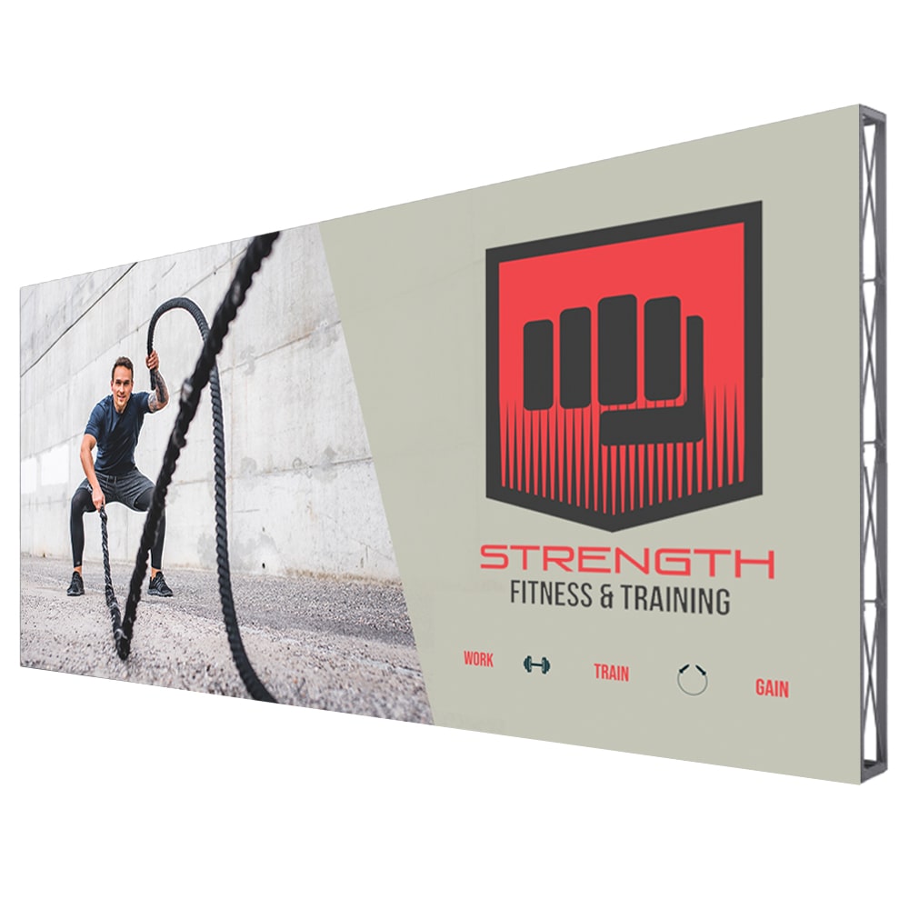 The Lumiere Light Wall setup features a single dye-sublimated fabric graphic stretched across two connected 10 ft. frames. As a result, this continuous design ensures your brand visuals remain uninterrupted and striking from end to end.