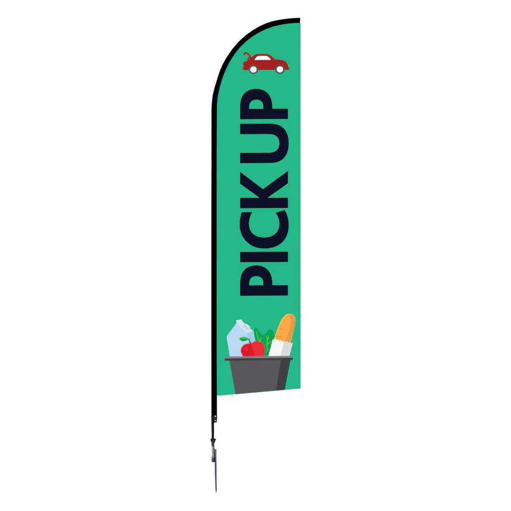 ONE CHOICE® Pre-Designed Flag is a great height for garnering attention outdoors. Custom printed on polyester mesh by the process of dye sublimation, inks heavily saturate the material to create a “bleed-through” visual effect for single-sided prints. In addition, double-sided prints are finished with a silver-gray blocker that lays between. Black flag trim is sewn on graphic for easy pole insertion. A set of grommets installed on the lower trim receives the short bungee cord (included) through its loop and snuggly attaches the graphic to the base. Finally, insert the spike base into the grass.